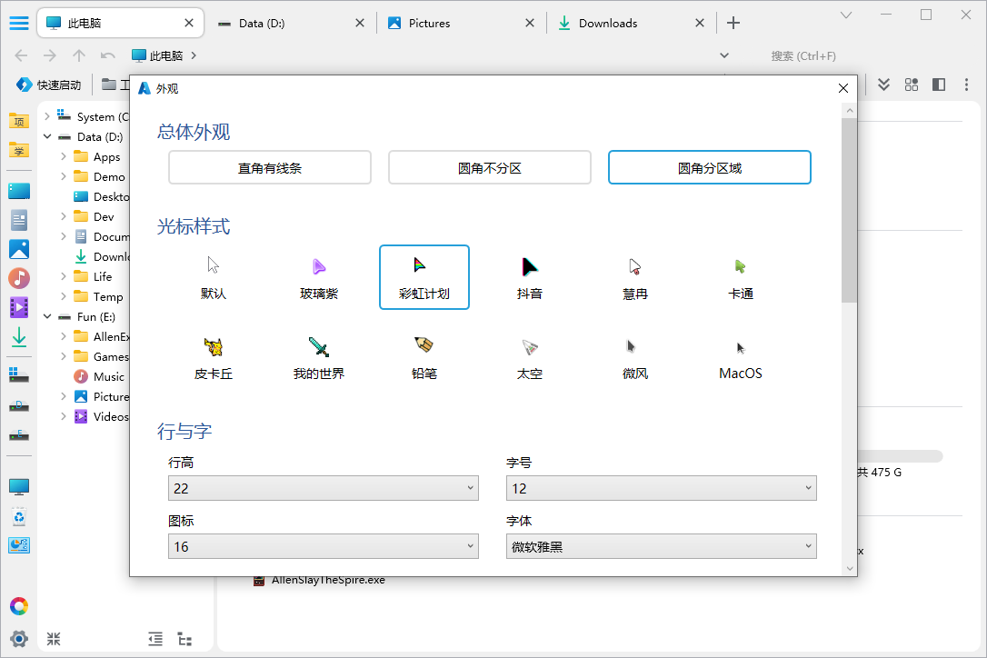 风格重构了界面图标,支持设置【总体外观】、【光标样式】、【行高】、【图标大小】、【字号】及【字体】等界面元素,并支持设置多种【主题】和【颜色】。