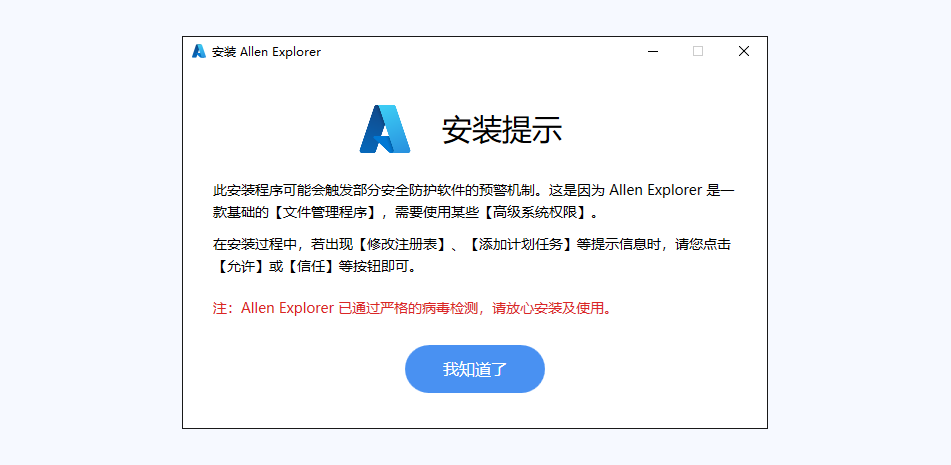 是一款基础的【文件管理程序】,需要使用某些【高级系统权限】,因此可能会触发部分安全防护软件的预警机制。在安装过程中,若出现【修改注册表】、【添加计划任务】等提示信息时,请您点击【允许】或【信任】等按钮即可。
